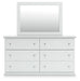 | Details | B139B42: Includes panel headboard/footboard and rails, Made with engineered wood (MDF/particleboard/plywood) and decorative laminate for the right balance of affordability and durability, Replicated solid white paint, Decorative laminate replicates natural or man-made material surfaces with consistent color, pattern and texture, Foundation/box spring required, sold separately, Mattress available, sold separately, Assembly required, B139B40: Includes dresser and mirror, Made of engineered wood (MDF/particleboard), Knobs with pewter-tone finish, Scalloped moulding, 6 smooth-operating drawers, Includes tipover restraint device, Mirror attaches to back of dresser; can also be mounted on wall horizontally or vertically, Safety is a top priority, clothing storage units are designed to meet the most current standard for stability, ASTM F 2057 (ASTM International), Drawers extend out to accommodate maximum access to drawer interior while maintaining safety, | |
