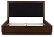Casual contemporary styling with a decidedly modern vibe. Bathed in a rich dark brown finish, this California king upholstered panel bed is warm and inviting. Full wrap-around rails set to the floor adorn your restful retreat with on-trend elegance. A cozy upholstered headboard with layback comfort features USB charging to keep your electronics at the ready. What a simply stunning way to achieve the bedroom of your dreams.