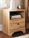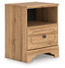 Country rustic. Vintage inspired. However you see it, you’re sure to be charmed by this nightstand. Adorned with a chic drawer knob and a warm oak grain finish, it offers a relaxed mix of picturesque aesthetics. Its storage space gracefully welcomes bedside necessities. And built-in USB charging adds a dose of modern convenience, keeping your devices powered up from dusk to dawn. With an air of easygoing elegance, this piece lets you drift away to a simpler time and place.
