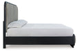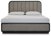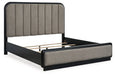 Rowanbeck California King Upholstered Panel Bed with Mirrored Dresser