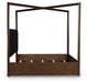 Casual contemporary styling with a decidedly modern vibe. Bathed in a rich dark brown finish, this king canopy bed is warm and inviting, while the integrated “X” canopy and full wrap-around rails set to the floor adorn your restful retreat with on-trend elegance. Dual USB charging on both sides of the upholstered headboard is a subtly cool way to keep your electronics at the ready. What a simply stunning way to achieve the bedroom of your dreams.