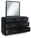 Details B821B4: Includes upholstered panel headboard, footboard and rails , Made with hardwood solids and ash veneer, Black finish on textured wood grain surface , Waterfall edges, Polyester upholstery, Foundation/box spring required, sold separately, Mattress available, sold separately, Assembly required, B821B1: Includes dresser and mirror, Made with hardwood solids and ash veneer, Black finish on textured wood grain surface , Burnished nickel-tone pulls, Waterfall edges, 7 smooth-gliding drawers with fully finished interior, dovetail construction and heavy duty ball-bearing side glides, Mirror attaches to back of dresser, B821-46: Made with hardwood solids and ash veneer, Black finish on textured wood grain surface, Burnished nickel-tone pulls, Waterfall edges, 5 smooth-gliding drawers with fully finished interior, dovetail construction and heavy duty ball-bearing side glides, B821-91: Made with hardwood solids and ash veneer, Black finish on textured wood grain surface, Brushed nickel-tone pulls, Waterfall edges, Smooth-gliding drawer with fully finished interior, dovetail construction and heavy duty ball-bearing side glides, Lower cubby shelf with built-in LED nightlight, 110V power supply with USB-A and USB-C charging ports, Power cord included; UL Listed,