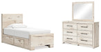 Details B2310B23: Includes panel headboard, panel footboard, 2 under bed storage units and roll slats , Made with engineered wood (MDF/particleboard/plywood) and decorative laminate for the right balance of affordability and durability, Rustic white finish over replicated reclaimed oak grain with authentic touch, Decorative laminate replicates natural or man-made material surfaces with consistent color, pattern and texture, 4 smooth-gliding storage drawers, Drawer interiors are lined with a faux linen laminate for a clean, finished look, Handles with dark pewter-tone finish, Bed does not require additional foundation/box spring; accommodates most zero clearance adjustable bases with the addition of a bunkie board , Mattress available, sold separately, Minor assembly required, B2310B1: Made with engineered wood (MDF/particleboard/plywood) and decorative laminate for the right balance of affordability and durability, Rustic white finish over replicated reclaimed oak grain with authentic touch, Decorative laminate replicates natural or man-made material surfaces with consistent color, pattern and texture, Handles with dark pewter-tone finish, 6 smooth-gliding drawers, Drawer interiors are lined with a faux linen laminate for a clean, finished look, Framed front and pilasters, Safety is a top priority, clothing storage units are designed to meet the most current standard for stability, ASTM F 2057 (ASTM International), Drawers extend out to accommodate maximum access to drawer interior while maintaining safety, Mirror attaches to back of dresser; can also be mounted on wall horizontally or vertically , Minor assembly required,