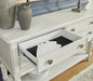 Transform your home into a haven of timeless elegance with this dining server. It pairs a classic antiqued white finish with reeded legs for traditional styling. Four drawers with fully finished interiors offer spacious storage for essentials. The large shelf is perfect for displaying mementos, magazines and more. Whether it's used as a sideboard, entryway table or TV stand, this piece serves your sense of relaxed refinement beautifully.