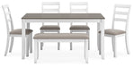 | Details | Includes dining table, bench and 4 chairs, Made with hardwood solids, veneer and MDF substrate, Clean white finish, Table top with gray wood-tone finish, Polyester upholstery, Foam cushioned seats, Assembly required | |