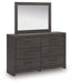 | Details | Includes dresser and mirror, Made with engineered wood (MDF/particleboard/plywood) and decorative laminate for the right balance of affordability and durability, Dark charcoal finish over replicated oak grain, Decorative laminate replicates natural or man-made material surfaces with consistent color, pattern and texture, Large handles with black finish, 6 smooth-gliding drawers, Framed front and pilasters, Mirror attaches to back of dresser; can also be mounted on wall horizontally or vertically , Safety is a top priority, clothing storage units are designed to meet the most current standard for stability, ASTM F 2057 (ASTM International), Drawers extend out to accommodate maximum access to drawer interior while maintaining safety, Minor assembly required | |