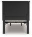 | Details | Includes panel headboard, storage footboard with roll slats and rails , Made with hardwood solids, birch veneer and MDF substrate, Side rails feature laminated solid hardwood slat support rails (or LVL) with glued and screwed blocking for added strength, Black painted finish, Round metal drawer knob with satin nickel-tone finish, Smooth-gliding drawer with ball-bearing side glides in footboard, Tapered feet, Bed does not require additional foundation/box spring; accommodates most zero clearance adjustable bases with the addition of a bunkie board, Mattress available, sold separately, Assembly required | |
