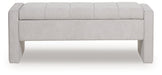 Details Polyester upholstery, Channel tufted seat cushion, Storage under hinged seat, Assembly required