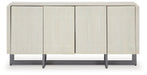 Details Made with solid wood and metal, Lightly distressed white finish, Subtle sandblasted effect enhances the wood grain, Metal base with pewter-tone finish, Door fronts with step pattern, 4 doors; 2 shelves, Openings in back for electronics, Assembly required
