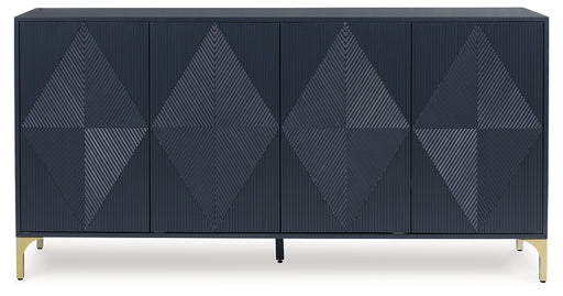 Signature Design by Ashley®Elevate your aesthetic with the chic design of this accent cabinet. Sleek goldtone legs and striking doors with a geometric pattern infuse contempo...