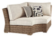 | Details | Includes 2 armless chairs with cushions, curved corner chair with cushion, left-arm facing loveseat and right-arm facing loveseat, "Left-arm" and "right-arm" describe the position of the arm when you face the piece, All-weather resin wicker handwoven over powder coated rust-proof aluminum frames, Cushions and pillows covered in high-performing Nuvella® fabric, All-weather foam cushion core wrapped in soft polyester, Clean fabric with mild soap and water, let air dry; for stubborn stains, use a solution of 1 cup bleach to 1 gallon water, Imported fabric and fill, Assembly required | |