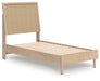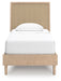 Clean-lined and contemporary—but far from stark—this twin panel bed is a fresh style awakening. Pairing a light finish with replicated oak grain and textured beige details that replicate the look of cane, its mixed materials bring a naturally versatile vibe to your bedroom. Talk about style with added dimension. The bed's simplicity plays perfectly with the modern aesthetic and is the stuff dreams are made of.