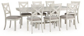 Details D642-01: Made with solid wood frame, Antiqued white finish with grain texture, Light gray polyester upholstery, Nailhead trim, X-back, Assembly required, D642-45: Made with rubberwood solids, ash veneer and MDF substrates, Antiqued white finish with grain texture, Tabletop with planked effect, Two 12" removable center leaves, Table extends to 86" overall by pulling both ends and dropping in leaves, Seats up to 8, Assembly required,