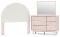 | Details | B1323-87: Made with durable engineered wood frame covered in a creamy white boucle, Polyester upholstery, ¼" bolts (not included) are needed to attach headboard to your existing bed frame, Minor assembly required, B1323B1: Includes dresser and mirror, Made with engineered wood (MDF/particleboard/plywood) and decorative laminate for the right balance of affordability and durability, Subtle blush finish over replicated pecan wood grain, Decorative laminate replicates natural or man-made material surfaces with consistent color, pattern and texture, Champagne colored knobs, 6 smooth-gliding drawers , Drawer interiors are lined with a faux linen laminate for a clean, finished look, Mirror can be attached to back of dresser or wall mounted horizontally or vertically, Safety is a top priority, clothing storage units are designed to meet the most current standard for stability, ASTM F 2057 (ASTM International) , Drawers extend out to accommodate maximum access to drawer interior while maintaining safety, Minor assembly required, | |
