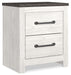 Cool, clean and casually modern. This nightstand's wispy whitewash and gray finish sets the tone for your calming sanctuary. Large linear pulls add dimension and authenticity. Two smooth-gliding drawers neatly accommodate your bedside needs.