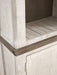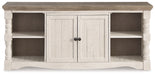 | Details | Includes TV stand, 2 pier cabinets and bridge, Made of pine wood, pine veneer and engineered wood , Two-tone distressed finish: weathered gray top; vintage white base, TV stand with 2-door cabinet with single-shelf storage and 2 open shelves, Each pier cabinet with 2 fixed shelves and cabinet with single-shelf storage, Aged iron-color hardware, Cutouts for wire management, Assembly required | |