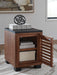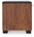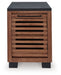 Double down on casual chic with the two-tone look of this chairside end table. Its warm brown and matte black finishes reflect your eye for modern design. The trend-right slatted styling brings added charm. And with a handy cabinet and shelf, keeping sofa-side essentials close is a breeze.