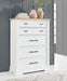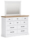 Details B844B4: Includes panel headboard, storage footboard, rails and roll slats, Footboard made with hardwood solids, MDF substrates and butcher block oak veneer, Headboard and rails made with hardwood solids and MDF substrates, White finish, Headboard with inset black metal barn sash, 2 drawers in footboard with fully finished interior, dovetail construction and ball-bearing side glides, Pulls with matte black finish, Bed does not require a foundation/box spring, Mattress available, sold separately, Assembly required, B844B1: Includes dresser and mirror, Made with hardwood solids, MDF substrates and butcher block oak veneer, Dresser with 2-tone finish (white finish; butcher block oak veneer with natural finish), Pulls with matte black finish, 10 spacious drawers with fully finished interiors (top drawers felt lined), dovetail construction and ball-bearing side glides , Drawers with inset picture fronts, Mirror attaches to back of dresser, B844-46: Made with hardwood solids, MDF substrates and butcher block oak veneer, 2-tone finish (white finish; butcher block oak veneer with natural finish), Pulls with matte black finish, 5 spacious drawers with fully finished interiors (top drawers felt lined), dovetail construction and ball-bearing side glides, Drawers with inset picture frame fronts, B844-93: Made with hardwood solids, MDF substrates and butcher block oak veneer, 2-tone finish (white finish; butcher block oak veneer with natural finish), Pulls with matte black finish, 3 spacious drawers with fully finished interiors (top drawers felt lined), dovetail construction and ball-bearing side glides, 110V power supply with dual USB charging ports, Power cord included; UL Listed, Drawers with inset picture frame fronts,