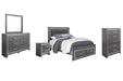 | Details | B214-46: Made of engineered wood (MDF/particleboard) and decorative laminate, Gray finish with replicated wood grain, Faceted chrome-tone pulls and accents, 5 smooth-operating drawers, Drawer interiors are lined with a faux linen laminate for a clean, finished look, Safety is a top priority, clothing storage units are designed to meet the most current standard for stability, ASTM F 2057 (ASTM International), Drawers extend out to accommodate maximum access to drawer interior while maintaining safety, B214-92: Made of engineered wood (MDF/particleboard) and decorative laminate, Gray finish with replicated wood grain, Faceted chrome-tone pulls and accents, 2 smooth-operating drawers, Drawer interiors are lined with a faux linen laminate for a clean, finished look, USB and wireless charging options, Power cord included; UL Listed, Assembly required, B214B1: Made of engineered wood (MDF/particleboard) and decorative laminate, Gray finish with replicated wood grain, Faceted chrome-tone pulls and accents, 6 smooth-operating drawers, Drawers lined with faux linen laminate, Mirror attaches to back of dresser, Includes tipover restraint device, Assembly required, B214B3: Includes headboard, footboard and side rails, Made of engineered wood (MDF/particleboard) and decorative laminate, Gray finish with replicated wood grain, Faux leather upholstery, Faux crystal and faceted chrome-tone metal accents, Accent LED lights with remote to control color and brightness, 2 smooth operating drawers, Power cord included; UL Listed, Small Space Solution, Foundation/box spring required, sold separately, Mattress available, sold separately, Assembly required, Bed is not compatible with an adjustable base, | |