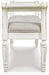 A classic to be cherished for years. This accent bench is a timeless treasure. Quality wood frame flaunts an antiqued white finish. Touches like the scrolled arms and floral applique give this piece so much character. You’ll love sitting on the cushiony, tufted seat in all of its sophistication.