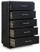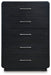 Details Made with hardwood solids and ash veneer, Black finish on textured wood grain surface, Burnished nickel-tone pulls, Waterfall edges, 5 smooth-gliding drawers with fully finished interior, dovetail construction and heavy duty ball-bearing side glides