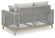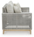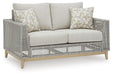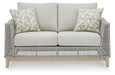 This loveseat invites your casual contemporary style outdoors. With its resin wicker in a chic neutral hue, it expertly marries refined design with durability. Breezy summer mornings and cold winter nights are made all the more comfortable with high-performance Nuvella+ fabric covering the cushion.