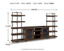 Details Includes TV stand and 2 etagere-style piers, Made of acacia veneers, wood, engineered wood and metal, Oiled walnut-tone finish, Dark bronze-tone metal hardware, TV stand with 2 glass-front cabinets, each with an adjustable shelf, adjustable/removable center shelf, open cubby and cutouts for wire management, Pair of metal-frame piers, each with 5 fixed shelves, Compatible with W100-02 and W100-101 electric fireplace inserts (sold separately), Assembly required