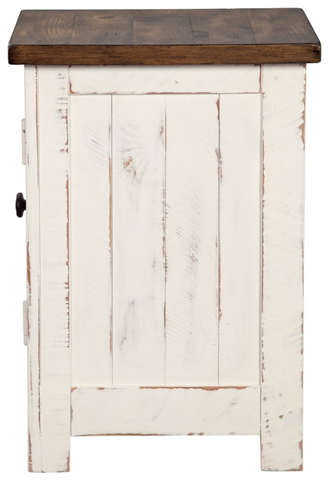Double take. Sporting a two-tone finish that pairs a distressed vintage white with aged natural pine color, this chairside end table elevates the art of rustic farmhouse living. Enhancing its charm: shelved storage visible through the cabinet door with inset metal grill.